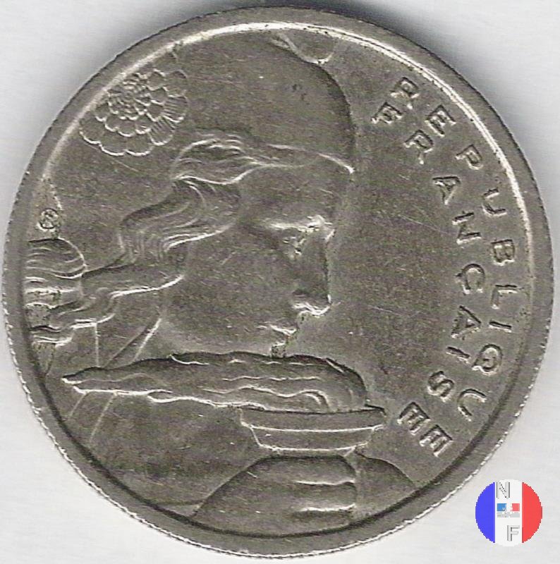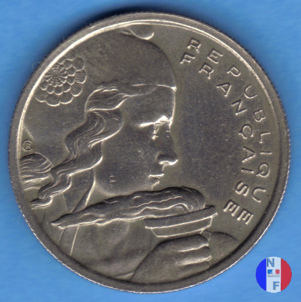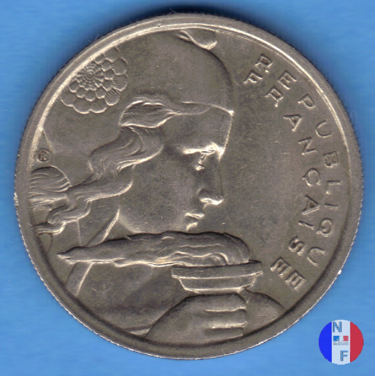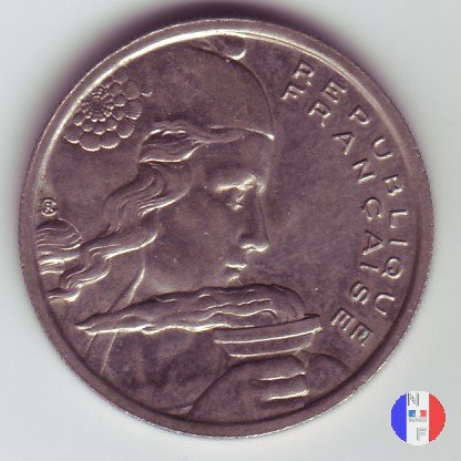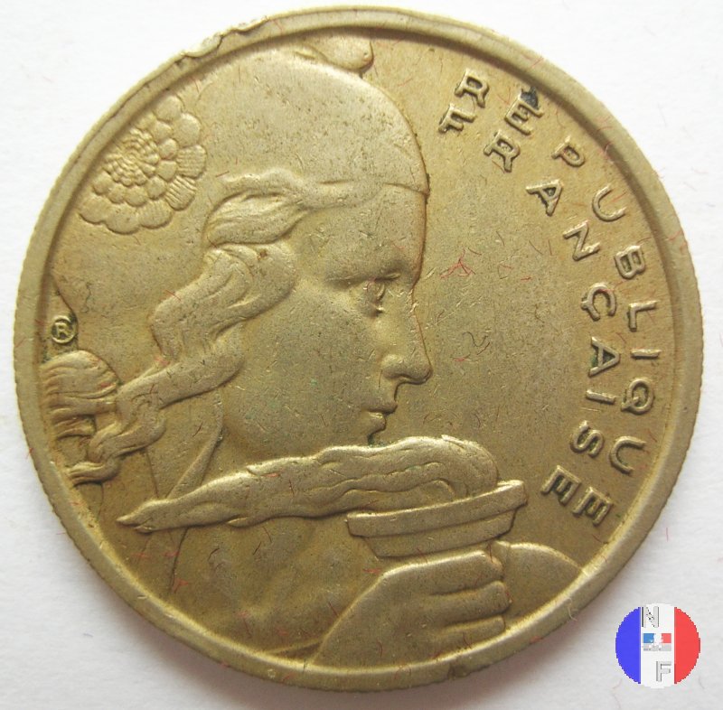 Questa moneta fu demonetizzata dal decreto del 3 agosto 1966 e fu ritirato il 95% dei pezzi prodotti. L'eventuale segno di zecca si trova al rovescio, tra i due rametti del ramoscello d'ulivo. SEGNI DI ZECCA: B = Beaumont le Roger / senza segno di zecca = Parigi | ||||||||