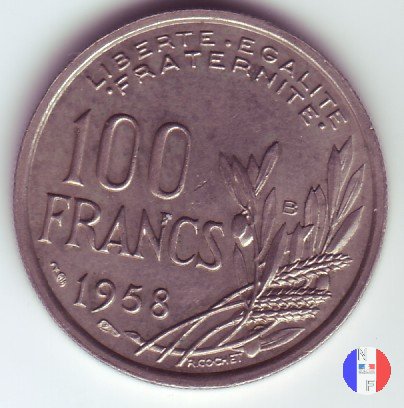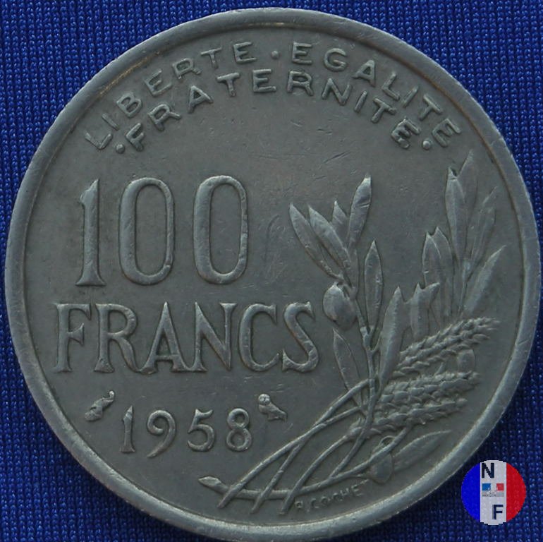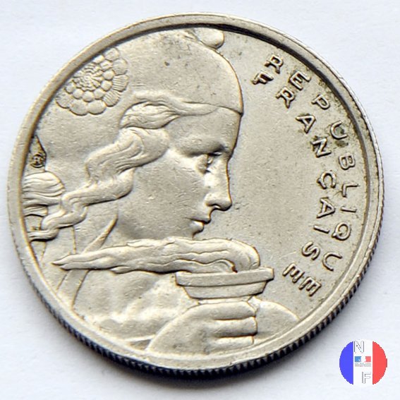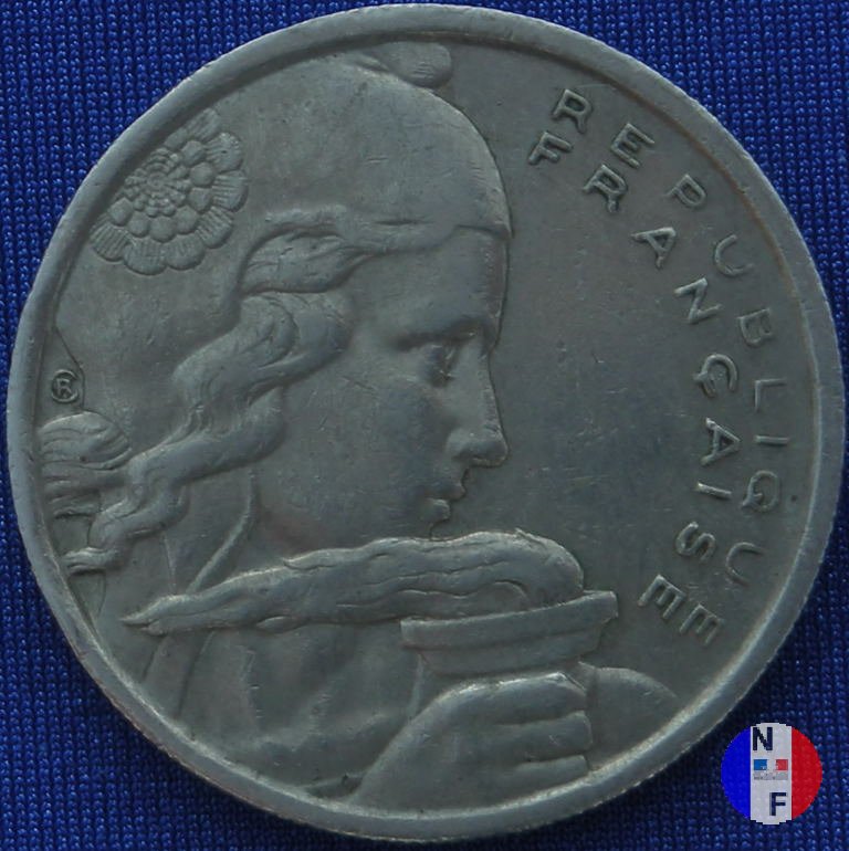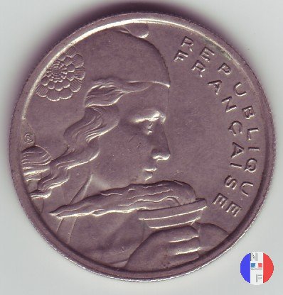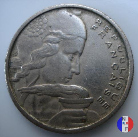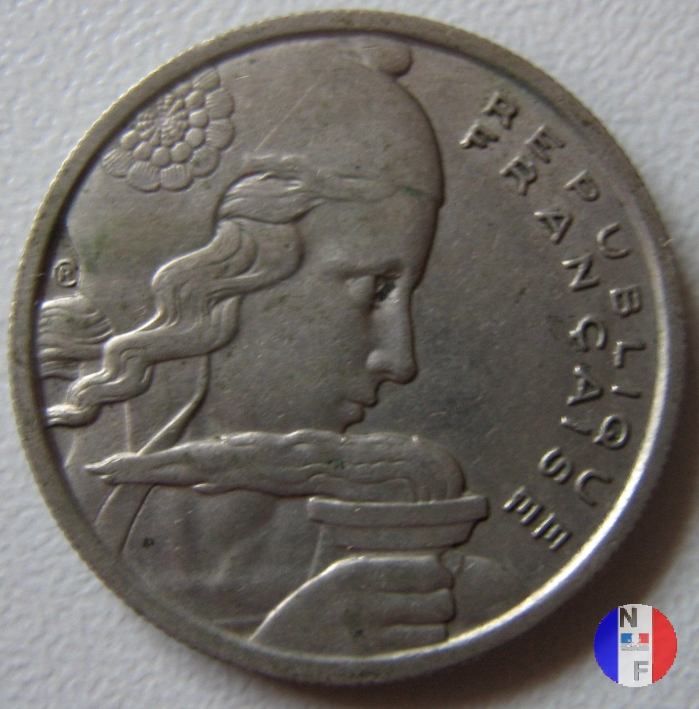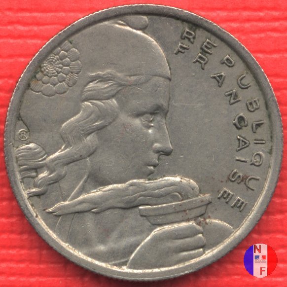 Questa moneta fu demonetizzata dal decreto del 3 agosto 1966 e fu ritirato il 95% dei pezzi prodotti. L'eventuale segno di zecca si trova al rovescio, tra i due rametti del ramoscello d'ulivo. SEGNI DI ZECCA: B = Beaumont le Roger / senza segno di zecca = Parigi | ||||||||