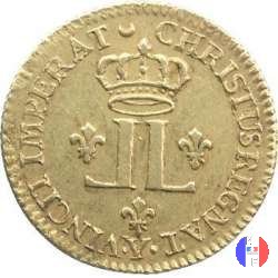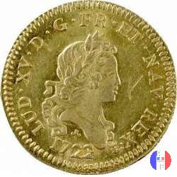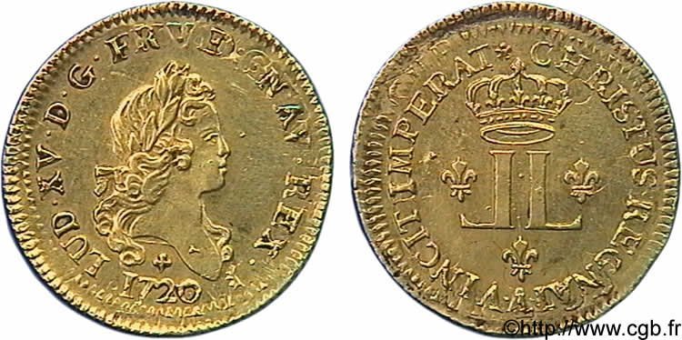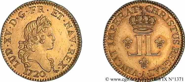 | Incisore: Norbert Roettiers.Valore legale 54 Livres,fabbricata in base all'editto del 30 settembre1720,nel quadro della terza riforma del regno di Luigi XV.Le monete riformate si riconoscono per un trifoglio sotto il busto.Svalutata sino a 39 Livres 12 sols al momento della sua demonetizzazione.Per l'indicazione degli indici di rarità ci siamo riferiti al volume V.Gadoury,Monnaies Royales Francaises.ed.2012 | ||||||||
