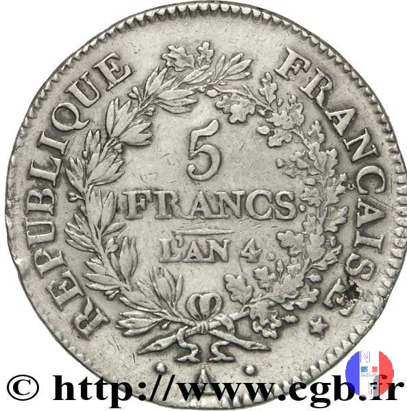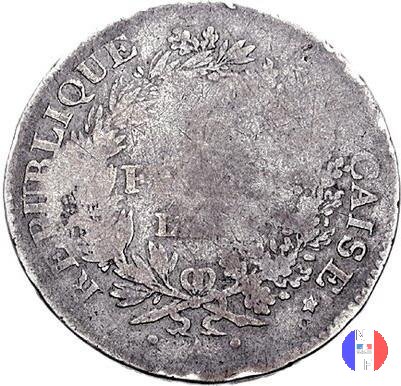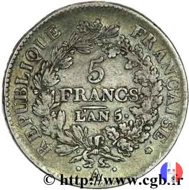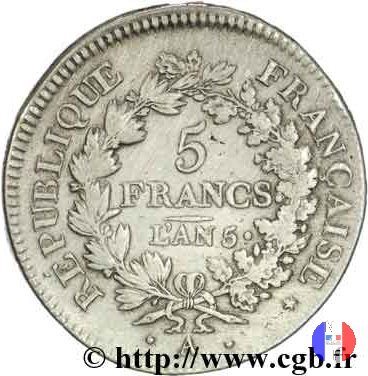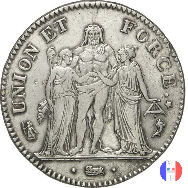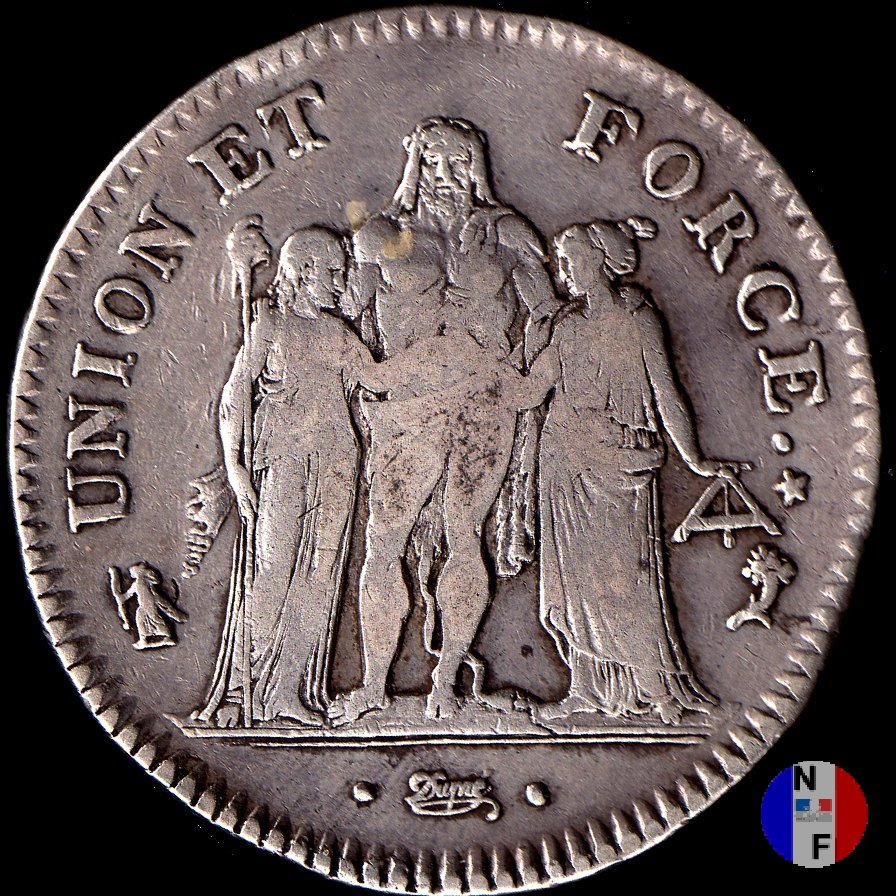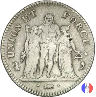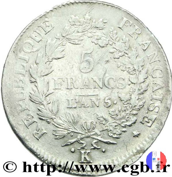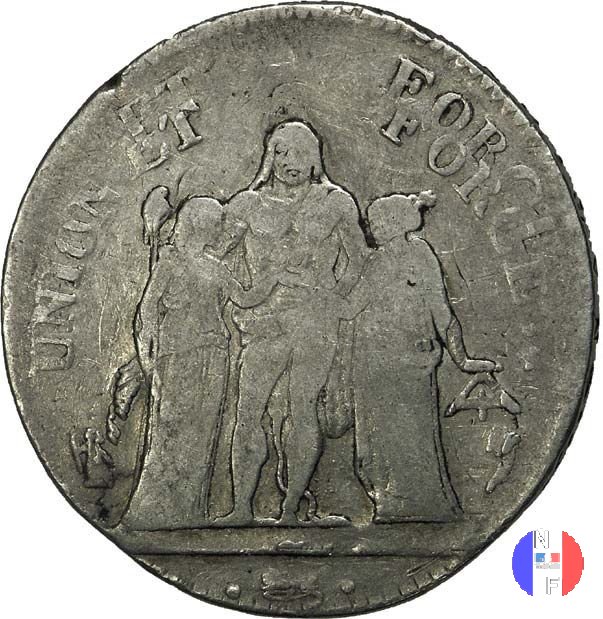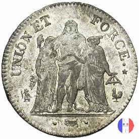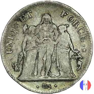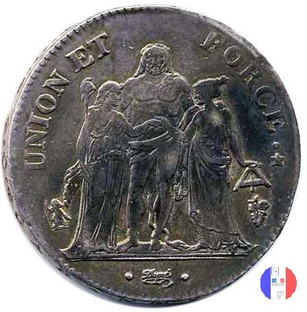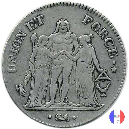 Questa moneta fu creata dal decreto del 15 agosto 1795. La coniazione terminò il 18 germinale anno 11 (8 aprile 1803). Per le monete degli anni 8, 9, 10 e 11 vedi "Consolato". SEGNI DI ZECCA: A = Parigi / BB = Strasburgo / K = Bordeaux / L = Bayonne / Q = Perpignan / T = Nantes / W = Lilla | |||||||||||||||||