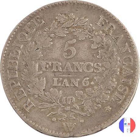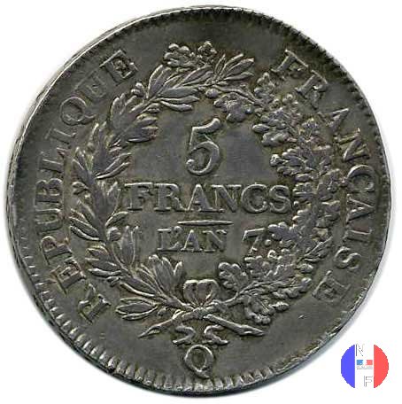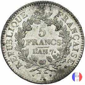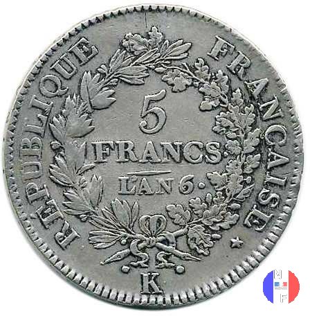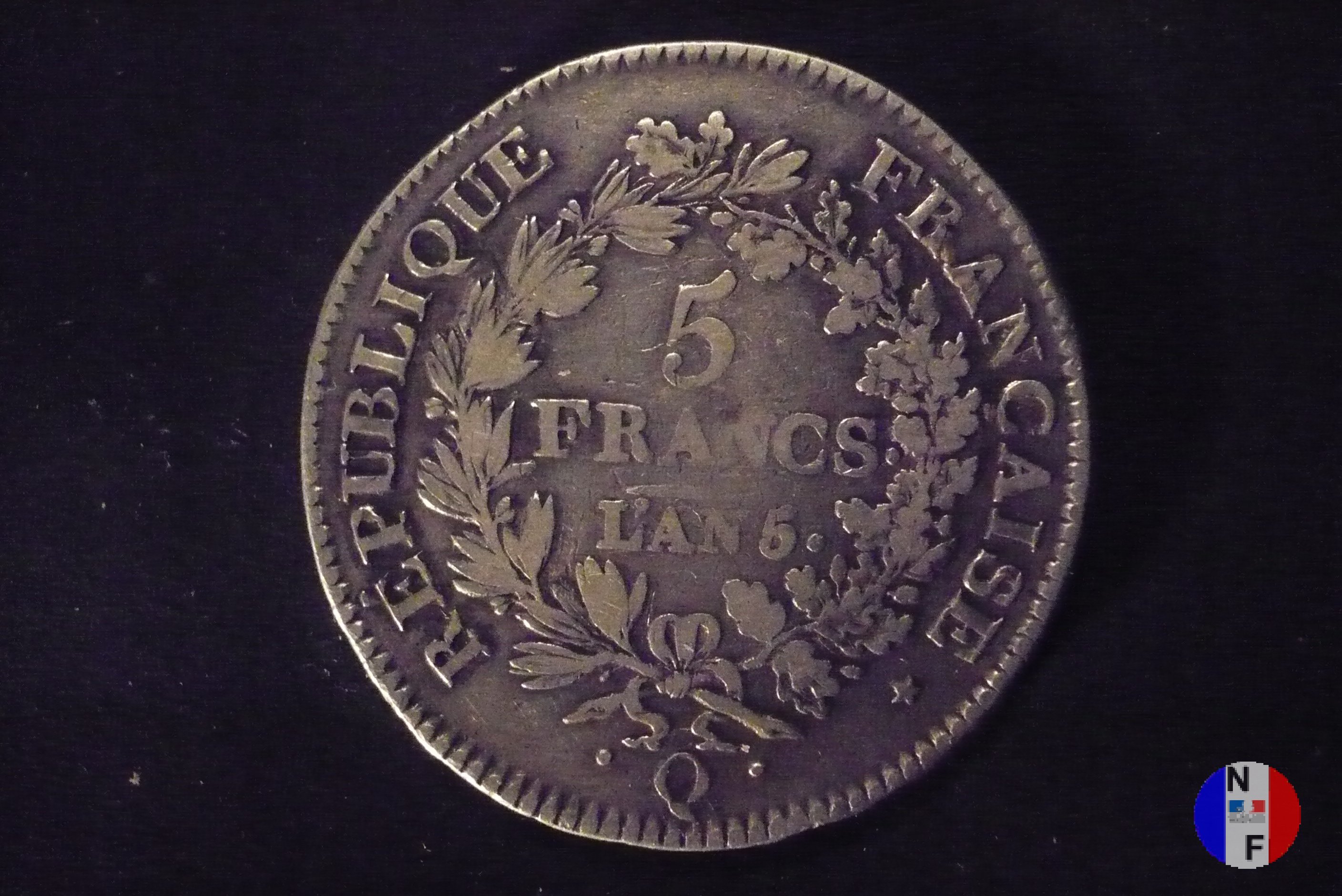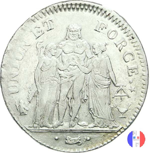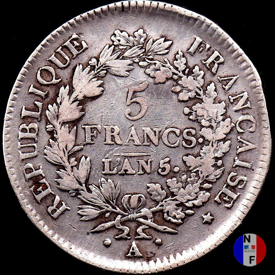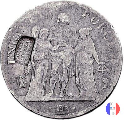 Questa moneta fu creata dal decreto del 15 agosto 1795. La coniazione terminò il 18 germinale anno 11 (8 aprile 1803). Per le monete degli anni 8, 9, 10 e 11 vedi "Consolato". SEGNI DI ZECCA: A = Parigi / BB = Strasburgo / K = Bordeaux / L = Bayonne / Q = Perpignan / T = Nantes / W = Lilla | |||||||||||||||||