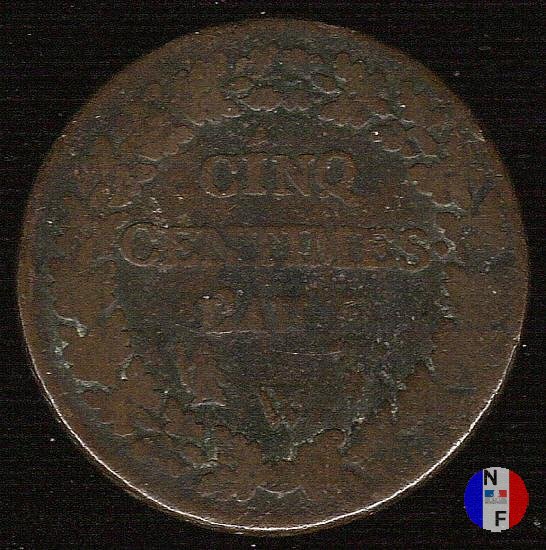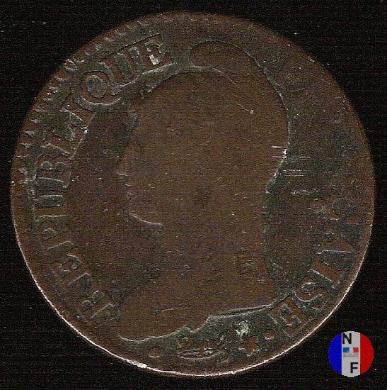 Questa moneta fu creata dal decreto del 24 ottobre 1796. La quantità inizialmente prevista (80.000.000 di pezzi) fu largamente oltrepassata e il 17 febbraio 1799 fu aumentata di altri 100.000.000. Per le monete degli anni 8 e 9, vedi "Consolato". SEGNI DI ZECCA - A = Parigi / B = Rouen / BB = Strasburgo / D = Lione / G = Ginevra / I = Limoges / K = Bordeaux / R = Orleans / T = Nantes / U = Torino / W = Lilla La centralizzazione della coniazione ha portato alla realizzazione di molte varianti, sia per anno che per zecca. | |||||||||||||||||||||||