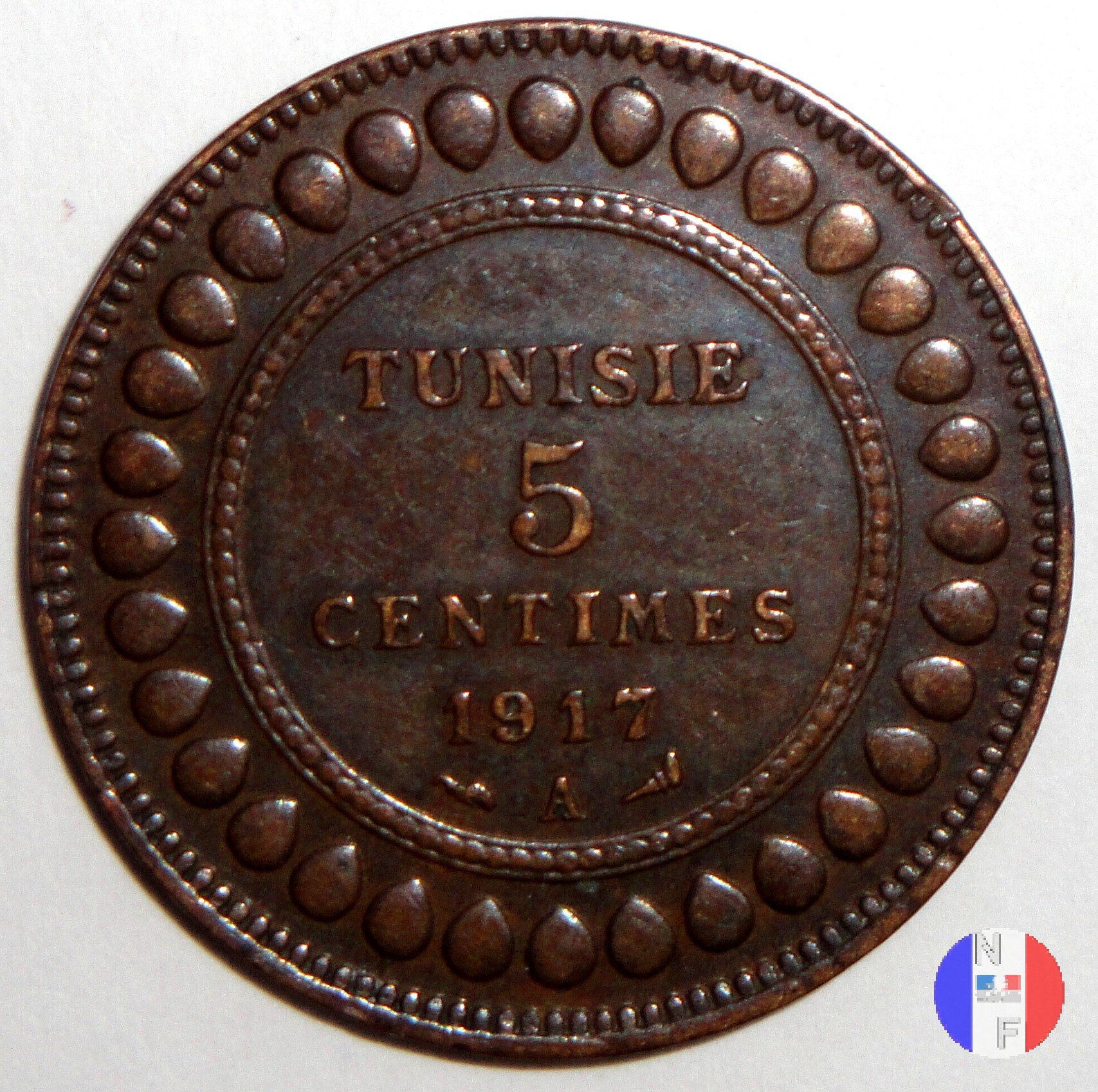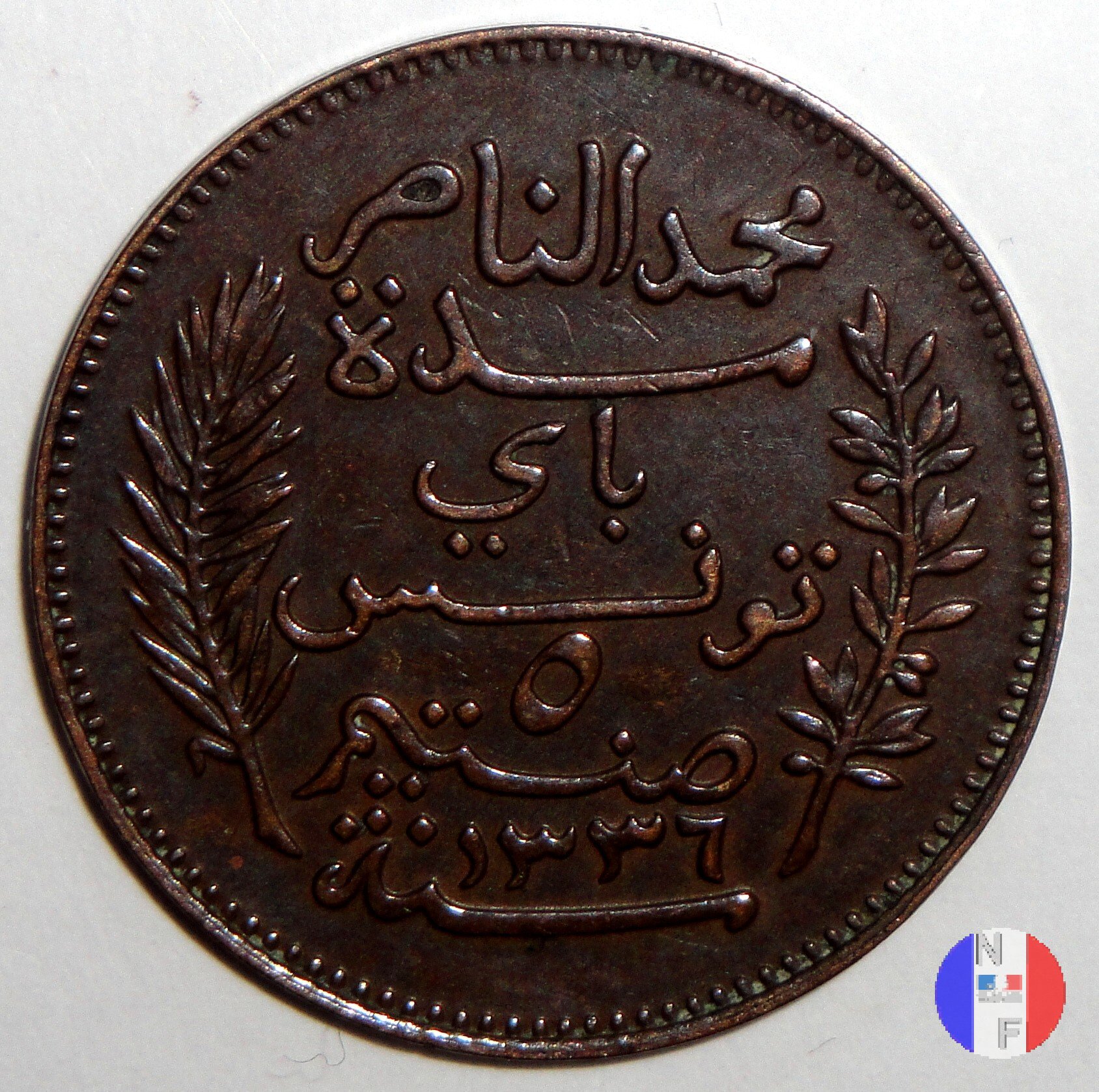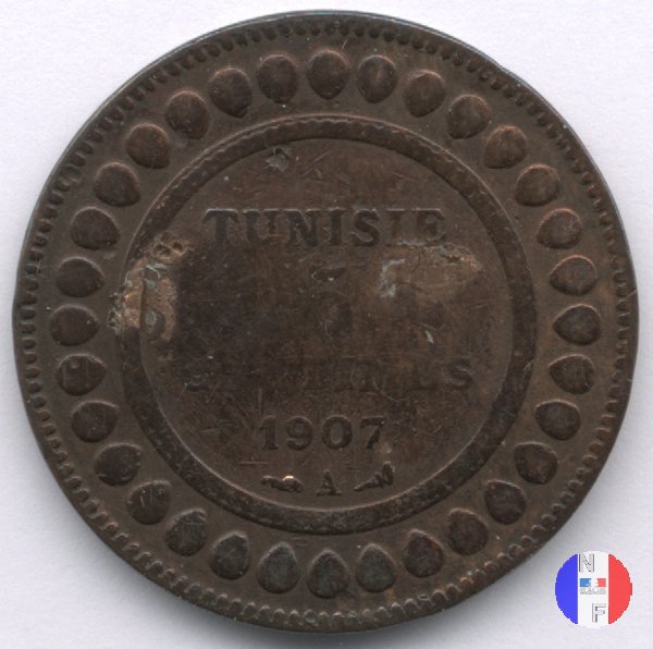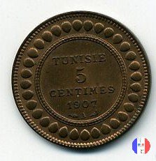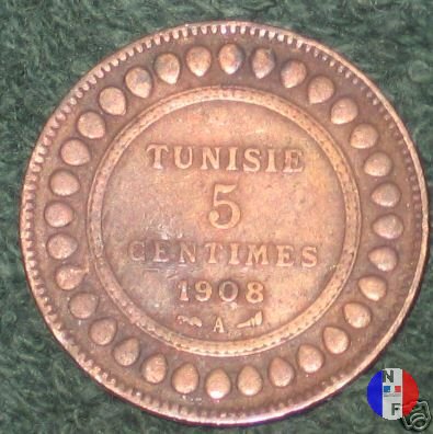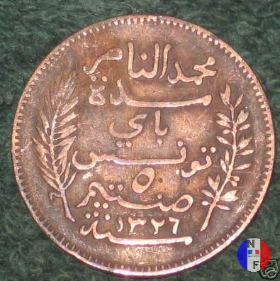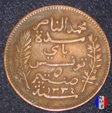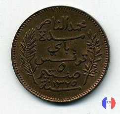 La scritta islamica significa: al tempo di Muhammad al-Nasir, bey di Tunisi - 5 centesimi - anno (anno islamico) SEGNI DI ZECCA: A = Parigi | |||||