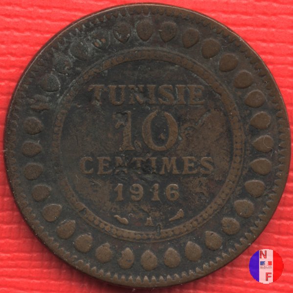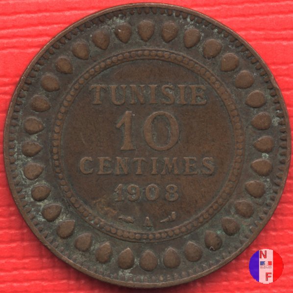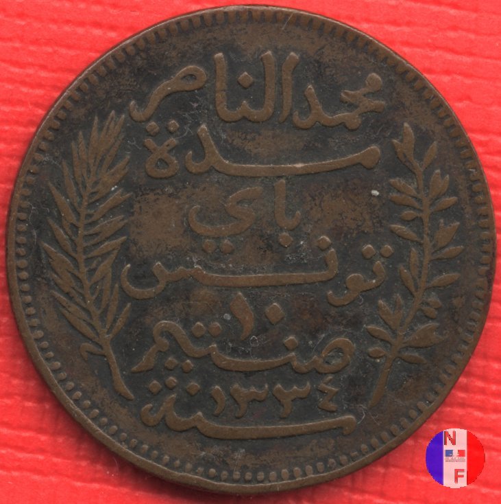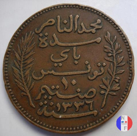 La scritta islamica significa: al tempo di Muhammad al-Nasir, bey di Tunisi - 5 centesimi - anno (anno islamico) SEGNI DI ZECCA: A = Parigi | |||||
