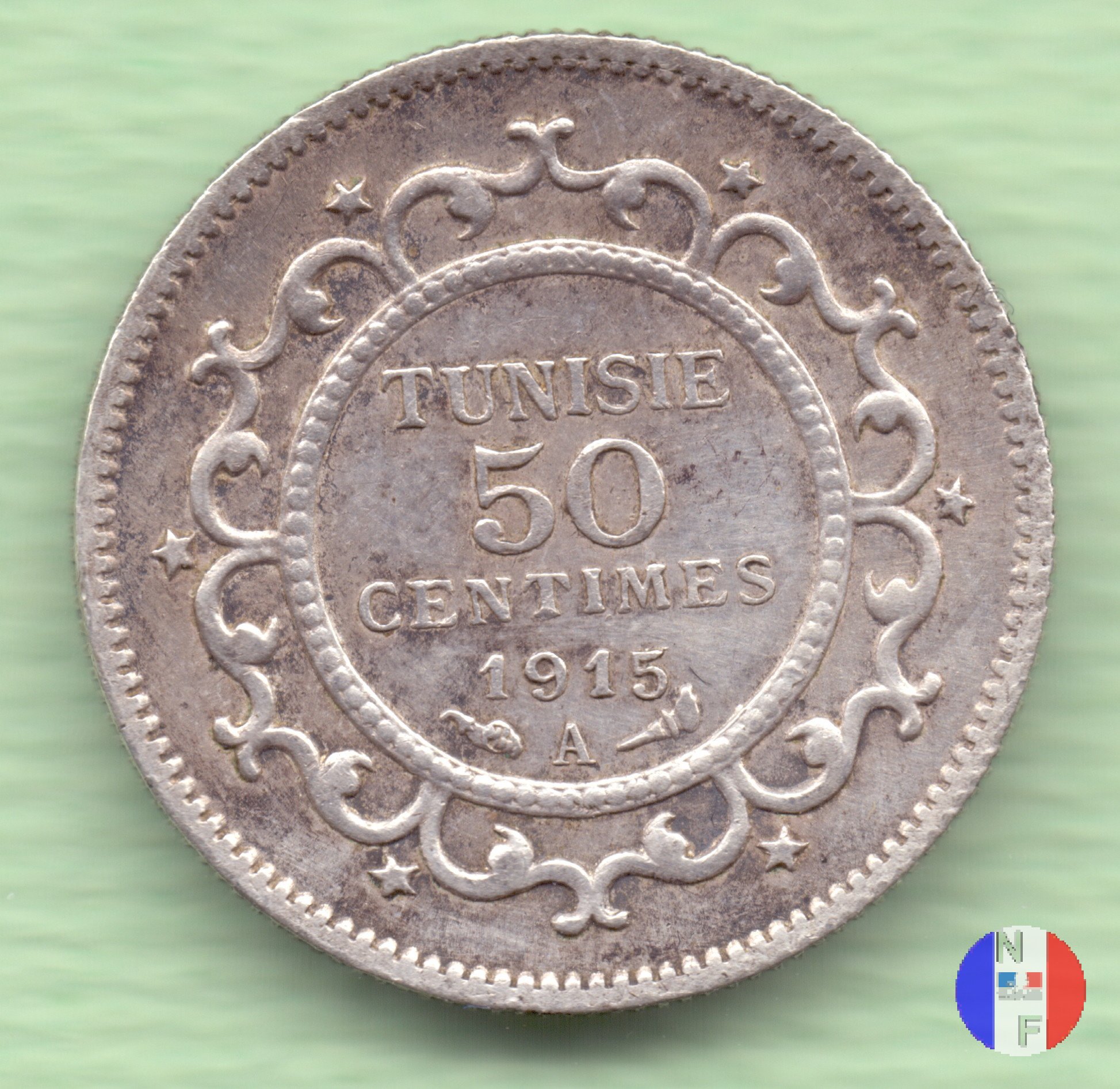 La scritta islamica significa: al tempo di Muhammad al-Nasir, bey di Tunisi - 50 centesimi - anno (anno islamico) SEGNI DI ZECCA: A = Parigi | ||||||||||||||||||||||||