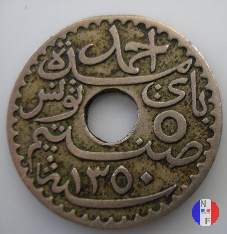 La scritta in arabo significa: al tempo di Ahmad, bey di Tunisi - 5 centesimi - anno (anno islamico)