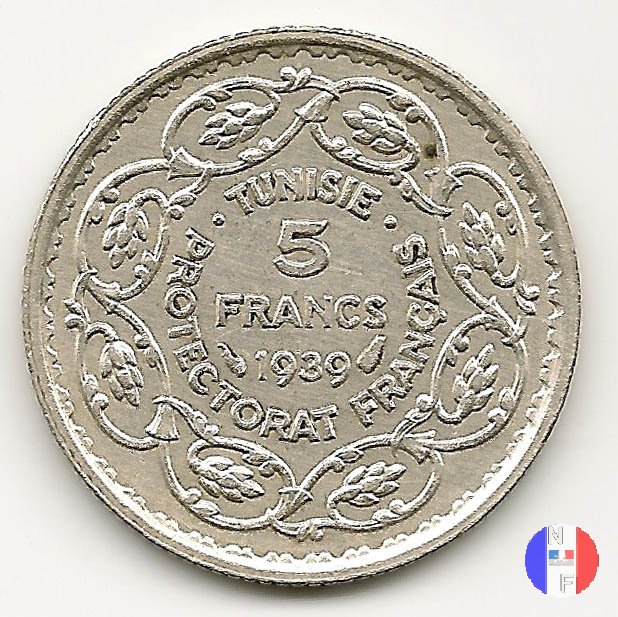 | La scritta in arabo significa: Ahmad, bey di Tunisi - 5 franchi - (anno islamico) | |||||
