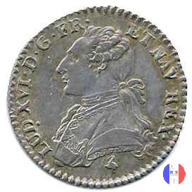 Busto (volto a sinistra) di Luigi XVI, portante une veste ricamata, l'ordine del Santo Spirito ed i capelli annodati sulla nuca da un nastro Scudo di Francia ovale coronato, tra due rami d'olivo