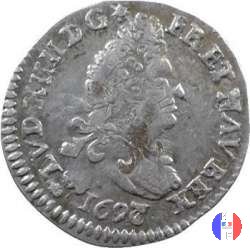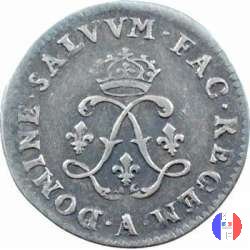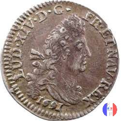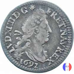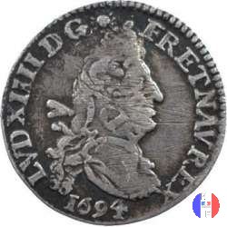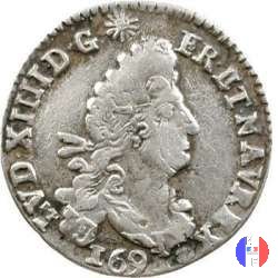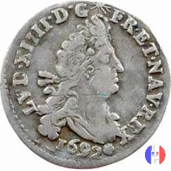 | Incisore:Joseph Roettiers.Emessa a seguito della dichiarazione del 28 agosto 1691,nel corso della prima riforma,questa moneta è riconiata sul 4 Sols detto dei "traitants". Demonetizzata il 30 agosto 1702,fu ritirata per 4 sols 2 denari,per essere poi riformata per 5 sols alle insegne. questa moneta esiste solo su tondello riconiato. Per l'indicazione degli indici di rarità ci siamo riferiti al volume V.Gadoury,Monnaies Royales Francaises.ed.2012 | ||||||||