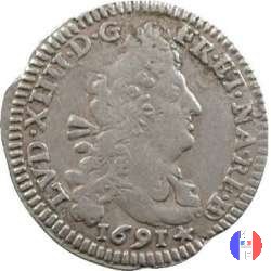 Incisore:Joseph Roettiers.Emessa a seguito della dichiarazione del 28 agosto 1691,nel corso della prima riforma,questa moneta è riconiata sul 4 Sols detto dei "traitants". Demonetizzata il 30 agosto 1702,fu ritirata per 4 sols 2 denari,per essere poi riformata per 5 sols alle insegne. Questa moneta esiste solo su tondello riconiato. Per l'indicazione degli indici di rarità ci siamo riferiti al volume V.Gadoury,Monnaies Royales Francaises.ed.2012