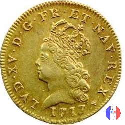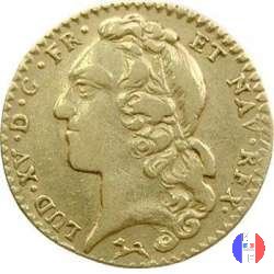 1/2 Luigi d'oro alla croce dello Spirito Santo Dritto: ↻ LUD •XV •D •G •FR •ET •NAV •REX (ANNO) Testa laureata del re a destra.Segno di zecca sotto il busto. Verso: ↻ CHRISTVS •REGNAT •VINCIT •IMPERAT Croce dell'ordine dello Spirito Santo con tre gigli al centro. | |