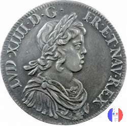 1/2 scudo di Navarra mèche longue Dritto: ↻ LVD.XIIII.D.G.FR.ET.NA.REX Busto infantile del re a destra, laureato,drappeggiato e corazzato all'antica,una lunga treccia sulla spalla. Verso: ↻ SIT.NOMEN.DOMINI.(SZ).BENEDICTVM.(ANNO) Scudo di Francia e Navarra coronato. | |