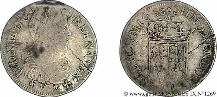 1/2 scudo mèche longue 1652-1656 Dritto: ↻ LVD.XIIII.D.G.FR.ET.NAV.REX Busto infantile del re a destra, laureato,drappeggiato e corazzato all'antica,una lunga treccia sulla spalla. Verso: ↻ SIT.NOMEN.DOMINI.(SZ).BENEDICTVM.(ANNO) Scudo di Francia coronato | |