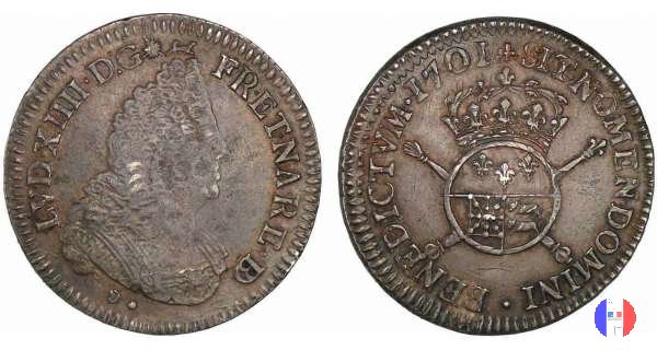 1/2 scudo alle Insegne Dritto: ↻ LVD.XIIII.D.G.FR.ET.NAV.REX Busto del re a destra. Verso: ↻ SIT.NOMEN.DOMINI.(SZ).BENEDICTVM.(ANNO) Stemma rotondo di Francia, coronato e posto tra due insegne. | |