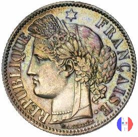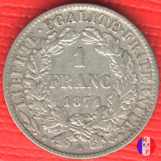 1 franco Cerere Dritto: REPUBLIQUE FRANÇAISE. - E.A.OUDINE.F. Busto della dea Cerere (volto a sinistra) coronato da spighe di grano. In alto, una stella Verso: 1 FRANC - 1871 - LIBERTE.EGALITE. FRATERNITE - (sz) Corona formata da rami di quercia e ramoscelli d'ulivo | |