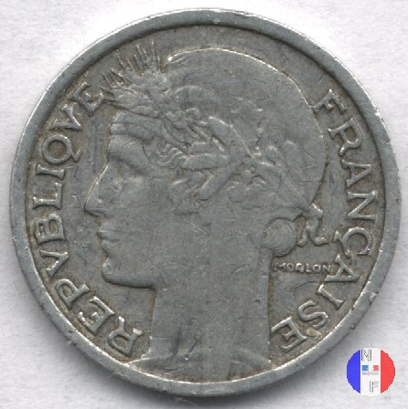 1 franco Morlon - bronzo-alluminio Dritto: REPUBLIQUE FRANÇAISE - MORLON Busto coronato di grano (volto a sinistra) della Marianna, che indossa il berretto frigio Verso: 1 FRANC - 1941 - LIBERTE-EGALITE FRATERNITE Due cornucopie | |