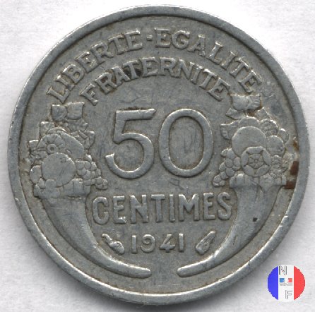 50 centesimi Morlon - bronzo-alluminio Dritto: REPUBLIQUE FRANÇAISE - MORLON Busto coronato di grano (volto a sinistra) della Marianna, che indossa il berretto frigio Verso: 50 CENTIMES - 1941 - LIBERTE-EGALITE FRATERNITE Due cornucopie | |