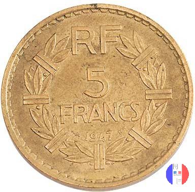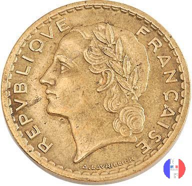 5 franchi - bronzo-alluminio Dritto: REPVBLIQVE FRANÇAISE - A.LAVRILLIER Testa laureata (volta a sinistra) della Repubblica Verso: RF - 5 FRANCS - (anno) - (sz) Corona d'alloro ornata da sette anelli | |