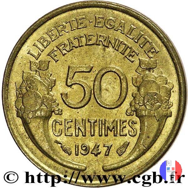50 centesimi Morlon - bronzo-alluminio Dritto: REPUBLIQUE FRANÇAISE - MORLON Busto coronato di grano (volto a sinistra) della Marianna, che indossa il berretto frigio Verso: 50 CENTIMES - 1947 - LIBERTE-EGALITE FRATERNITE Due cornucopie | |