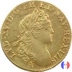 Luigi d'oro alla "vieille tete " Dritto: ↻ LUD •XV •D •G •FR •ET •NAV •REX Testa del re laureata a sinistra,busto drappeggiato. Monogramma R.FIL. sul taglio del collo. Verso: ↻ CHRS •REGN •VINC •IMPER Gli stemmi di Francia e di Navarra accostati e sormontati da un corona. |