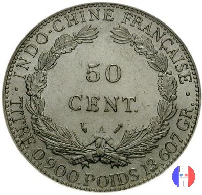50 centesimi Dritto: REPUBLIQUE FRANÇAISE - (anno) - BARRE La Libertà (seduta verso sinistra) regge un fascio. Davanti ad essa, quattro spighe di grano; dietro, un ancora Verso: 50 CENT. - INDO-CHINE FRANÇAISE - (vedi note) - (sz) Corona formata da un ramo di quercia, da uno di alloro e da due spighe di grano | |