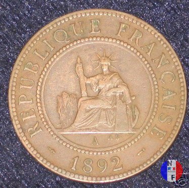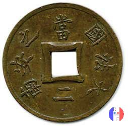 1 sapeque Dritto: INDO-CHNE FRANÇAISE - (anno) - (sz) - Verso: (legenda in caratteri cinesi) I due trattini in basso in centro sotto il buco centrale corrispondono alla cifra 2 che è il peso della moneta. | |