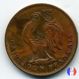 50 centesimi Dritto: REPUBLIQUE FRANÇAISE - A.Patey - (anno) Busto (volto a sinistra e coronato di alloro) della Marianna, che indossa il berretto frigio Verso: TERRITOIRES.SOUS.MANDAT.DE.LA.FRANCE - 50 CMES - CAMEROUN Tre rami di cacao legati con un nastro | |