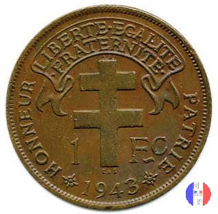 1 franco Libre Dritto: CAMEROUN FRANÇAIS LIBRE - RF Gallo; in alto, scudo con monogramma RF Verso: LIBERTÉ.ÉGALITÉ FRATERNITÉ - SA - CLS - 1 FC - 1943 - HONNEUR PATRIE Croce di Lorena e nastro con le parole LIBERTÉ.ÉGALITÉ FRATERNITÉ | |