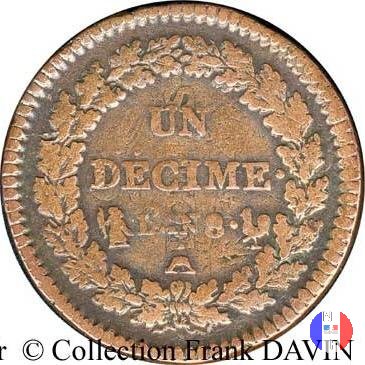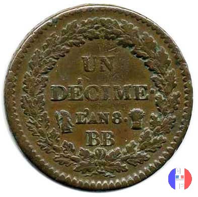 1 decimo - ribattuto su monete da 2 decimi Dritto: REPUBLIQUE FRANÇAISE - Dupré Testa della Libertà (volta a sinistra) che indossa il berretto frigio Verso: UN DECIME - L'AN 8 - (sz) Corona formata da due rami di quercia | |