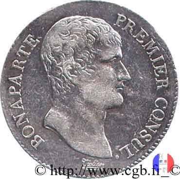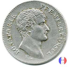 1/2 franco Dritto: BONAPARTE PREMIER CONSUL - Tiolier Busto (volto a destra) del primo console Napoleone Bonaparte Verso: DEMI FRANC - REPUBLIQUE FRANÇAISE - AN (anno) - (sz) Corona formata da due ramoscelli d'ulivo | |