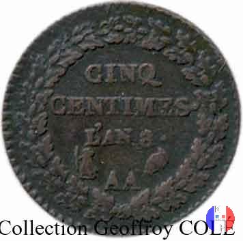 5 centesimi - ribattuti su monete da 1 decimo Dritto: REPUBLIQUE FRANÇAISE - Dupré Testa della Libertà (volta a sinistra) che indossa il berretto frigio Verso: CINQ CENTIMES - L'AN (anno) - (sz) Corona formata da due rami di quercia | |