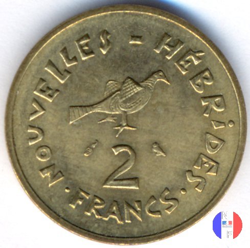 2 franchi Dritto: RÉPVBLIQVE FRANÇAISE - I.E.O.M - (anno) - R JOLY Testa (volta a sinistra) della Marianna Verso: NOUVELLES HÉBRIDES - 2 FRANCS Fregata minor | |