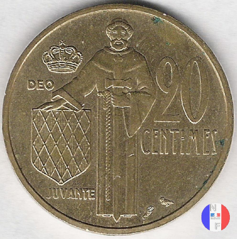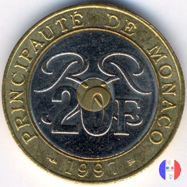 20 franchi - I tipo Dritto: RAINIER III PRINCE DE MONACO - (anno) - P.TURIN Busto (volto a sinistra) del principe Ranieri III Verso: 20 FRS - DEO JUVANTE Stemma coronato del Principato di Monaco | |