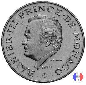 10 franchi - II tipo Dritto: RAINIER • III • PRINCE • DE • MONACO - G.SIMON Busto (volto a sinistra) del principe Ranieri III Verso: 10 FRANCS - (anno) Monogramma di Ranieri III sovrapposto allo stemma del Principato di Monaco | |