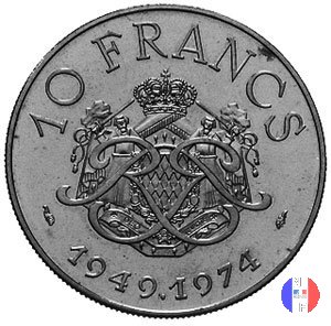 10 franchi 1974 - 25 anni di regno Dritto: RAINIER • III • PRINCE • DE • MONACO - G.SIMON Busto (volto a sinistra) del principe Ranieri III Verso: 10 FRANCS - 1949 • 1974 Monogramma di Ranieri III sovrapposto allo stemma del Principato di Monaco | |