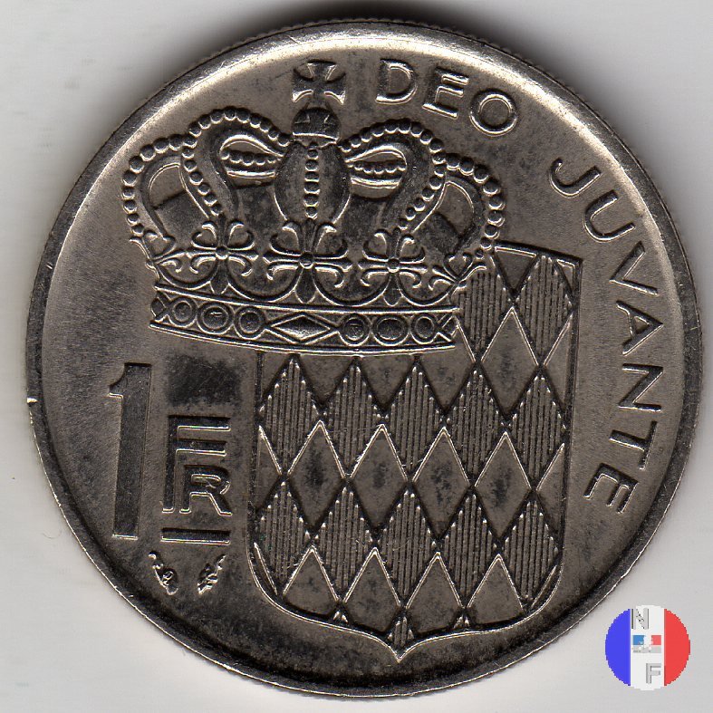 1 franco Dritto: RAINIER III PRINCE DE MONACO - (anno) - R.COCHET Busto (volto a destra) del principe Ranieri III Verso: 1 FR - DEO JUVANTE Stemma del Principato di Monaco; davanti ad esso, una corona | |