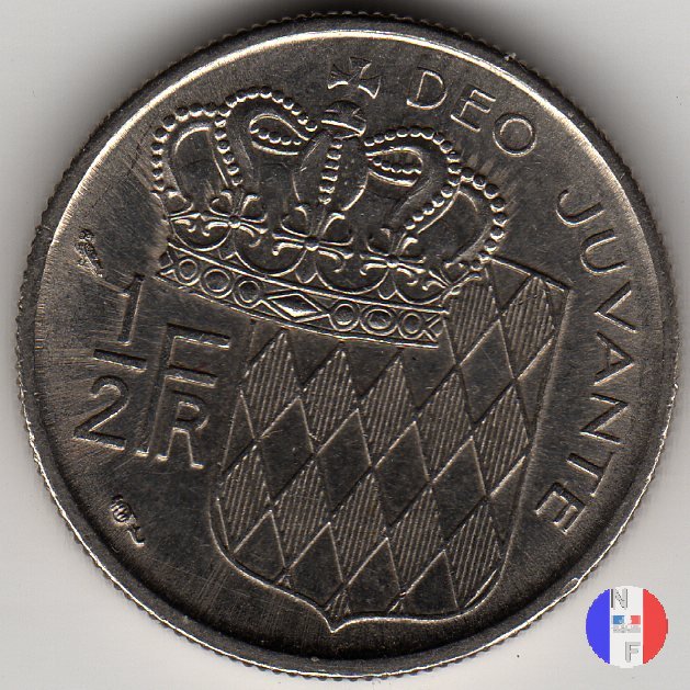 1/2 franco Dritto: RAINIER III PRINCE DE MONACO - (anno) - R.COCHET Busto (volto a destra) del principe Ranieri III Verso: 1/2 FR - DEO JUVANTE Stemma del Principato di Monaco; davanti ad esso, una corona | |