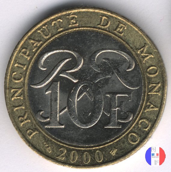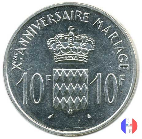10 franchi - I tipo Dritto: RAINIER III PRINCE DE MONACO - (anno) - P.TURIN Busto (volto a sinistra) del principe Ranieri III Verso: 10 FRS - DEO JUVANTE Stemma coronato del Principato di Monaco | |