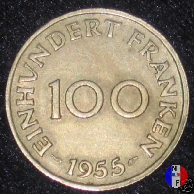 100 franchi Dritto: SAARLAND Stemma della Saar in cerchio decorativo Verso: 100 - EINHUNDERT FRANKEN - 1954 - |