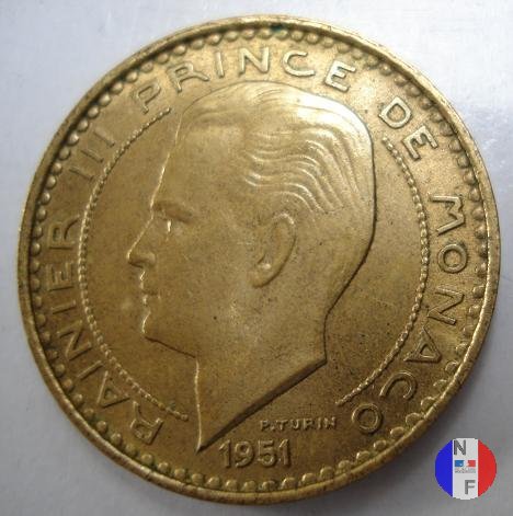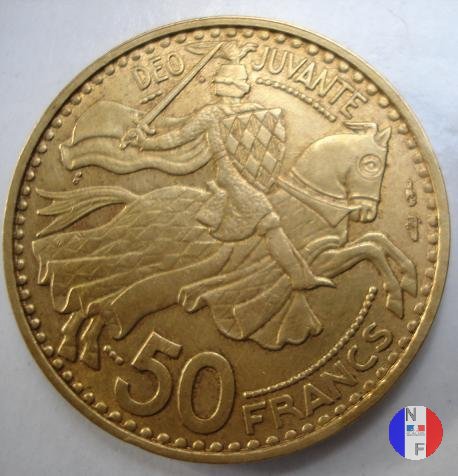 50 franchi 1950 Dritto: RAINIER III PRINCE DE MONACO - 1950 - P.TURIN Busto (volto a sinistra) del principe Ranieri III Verso: 50 FRANCS - DEO JUVANTE Un cavaliere avanza verso destra impugnando uno scudo ed una spada | |
