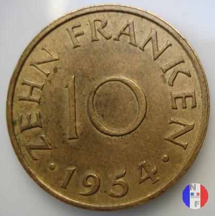 10 franchi Dritto: SAARLAND Stemma della Saar e macchine industriali Verso: 10 - ZEHN FRANKEN - 1954 - | |