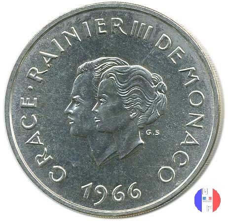 10 franchi 1966 - 10 anni di matrimonio Dritto: GRACE • RAINIER III DE MONACO Busti affiancati (volti a sinistra) della principessa Grace e del principe Ranieri III Verso: 10 F - 10 F - Xeme ANNIVERSAIRE MARIAGE Stemma coronato del Principato di Monaco | |