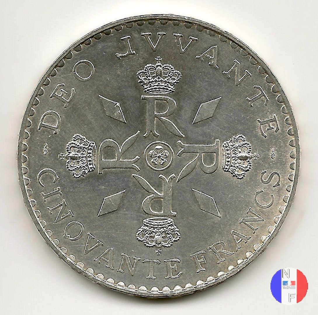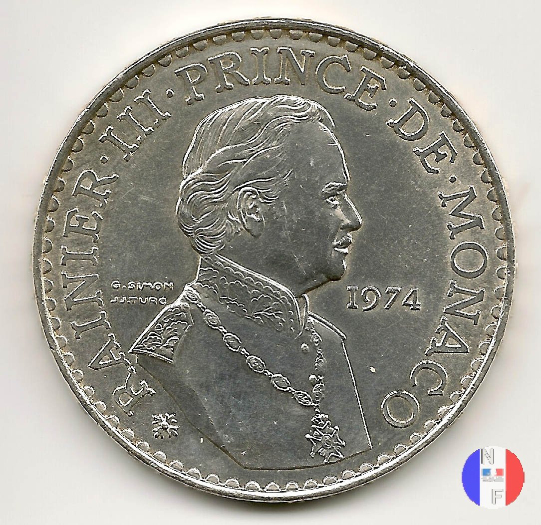 50 franchi 1974 - 25 anni di regno Dritto: RAINIER • III • PRINCE • DE • MONACO - 1974 - G.SIMON - J.J.TURC Busto (volto a destra) del principe Ranieri III Verso: CINQVANTE FRANCS - DEO JUVANTE Monogramma composto da quattro R coronate | |