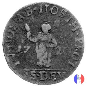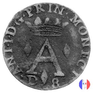 8 denari (dardenna) Dritto: ANT • I • D • G • PRIN • MONECI - D 8 A coronata e affiancata da tre rombi Verso: TV • NOS. AB • HOST • PROT • - 1720 - • S • DEV Santa Devota tra le onde | |