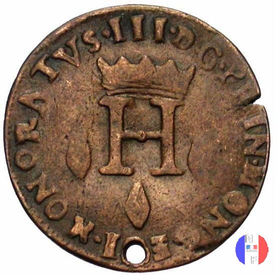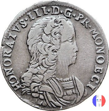 3 sols (pezetta) Dritto: HONORATVS • III • D • G • PR • MONOECI Busto corazzato (volto a destra) del principe Onorato III Verso: AVXILIVM MEVM A DOMINO - (anno) Croce formata da 4 monogrammi coronati, intercalata da rombi | |