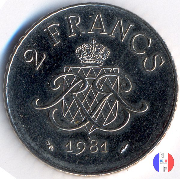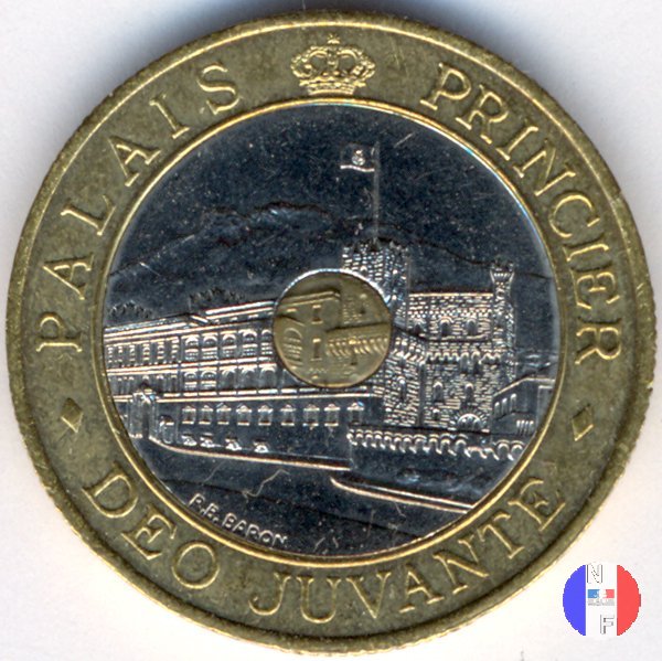 2 franchi Dritto: RAINIER • III • PRINCE • DE • MONACO - SIMON Busto (volto a destra) del principe Ranieri III Verso: 2 FRANCS - (anno) Monogramma di Ranieri III; dietro di esso, stemma coronato del Principato di Monaco | |