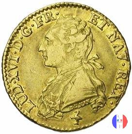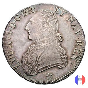 6 livres (scudo) Dritto: LUD XVI D G FR ET NAV REX - DUVIV Busto (volto a sinistra) di Luigi XVI, portante une veste ricamata, l'ordine del Santo Spirito ed i capelli annodati sulla nuca da un nastro Verso: SIT NOMEN DOMINI BENEDICTUM - (anno) - (sz) Scudo di Francia ovale coronato, tra due rami d'olivo | |