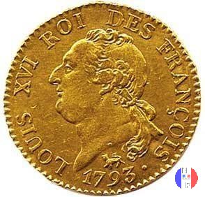 24 livres Dritto: LOUIS XVI ROI DES FRANÇOIS - (anno) Busto del re Luigi XVI, drappeggiato e volto verso sinistra Verso: REGNE DE LA LOI. - L'AN (an) DE LA LIBERTÉ - (sz) Il Genio della Repubblica (alato, in piedi e volto a destra) scrive su una tavola posta su un cippo. A sinistra, un fascio sormontato dalla mano della Giustizia; a destra un gallo |