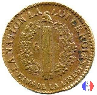 6 livres Dritto: LOUIS XVI ROI DES FRANÇOIS - (anno) Busto del re Luigi XVI, drappeggiato e volto verso sinistra Verso: REGNE DE LA LOI. - L'AN (an) DE LA LIBERTÉ - (sz) Il Genio della Repubblica (alato, in piedi e volto a destra) scrive su una tavola posta su un cippo. A sinistra, un fascio sormontato dalla mano della Giustizia; a destra un gallo | |