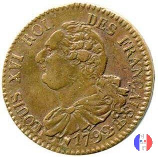 6 deniers (2 liard o 1/2 sol) Dritto: LUDOV • XVI • D • GRATIA Busto (volto a sinistra) del re Luigi XVI Verso: FRANCIÆ ET NAVARRÆ • REX • - (anno) - (sz) Stemma coronato dei Borbone | |